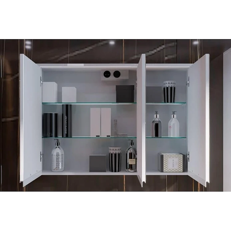 Шкаф имеет один отсек с тремя дверцами, пространство разделено двумя стеклянными полками.