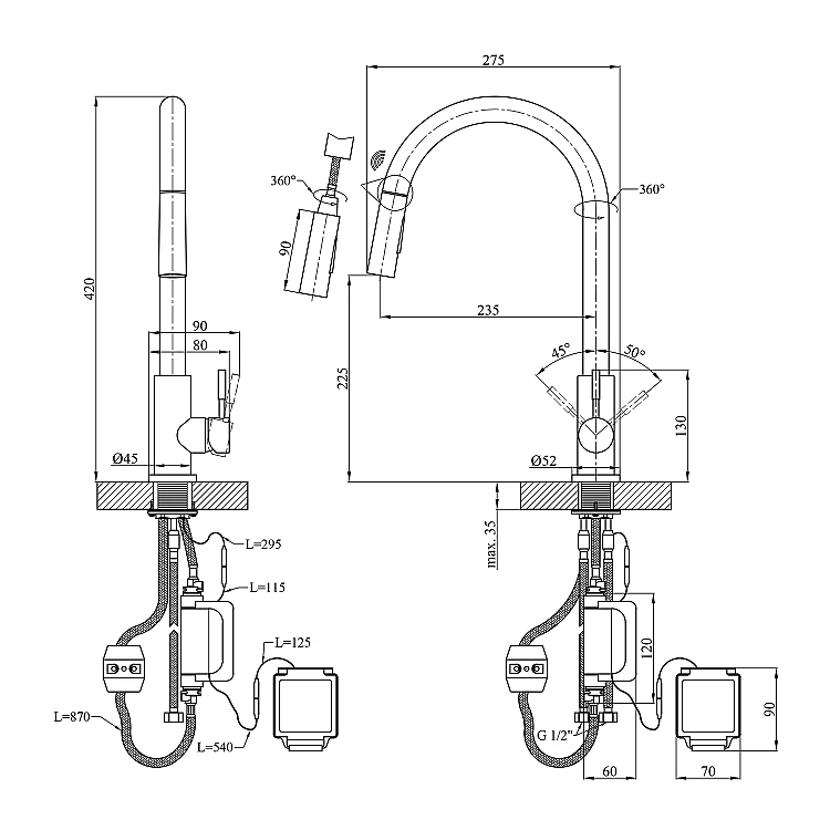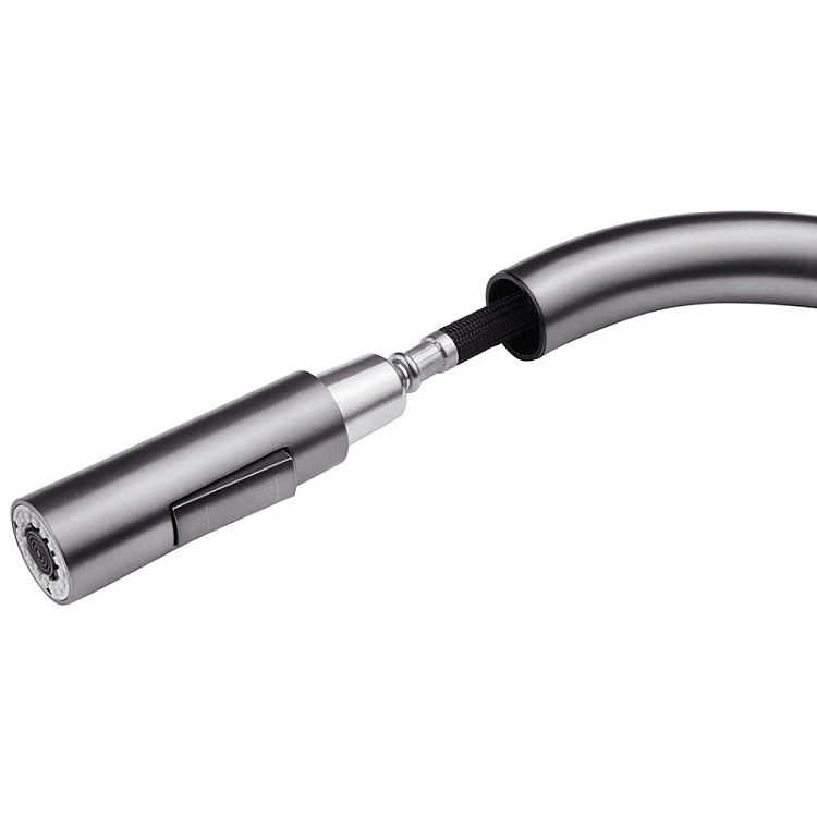 Смеситель имеет лаконичный дизайн и высокую функциональность. Выдвижная лейка снабжена шарниром, обеспечивающим вращение на 360 градусов. Два режима распыления – от потоковой струи без брызг до мощной струи душа – позволяют эффективно выполнять различные задачи, такие как ополаскивание посуды или удаление загрязнений.