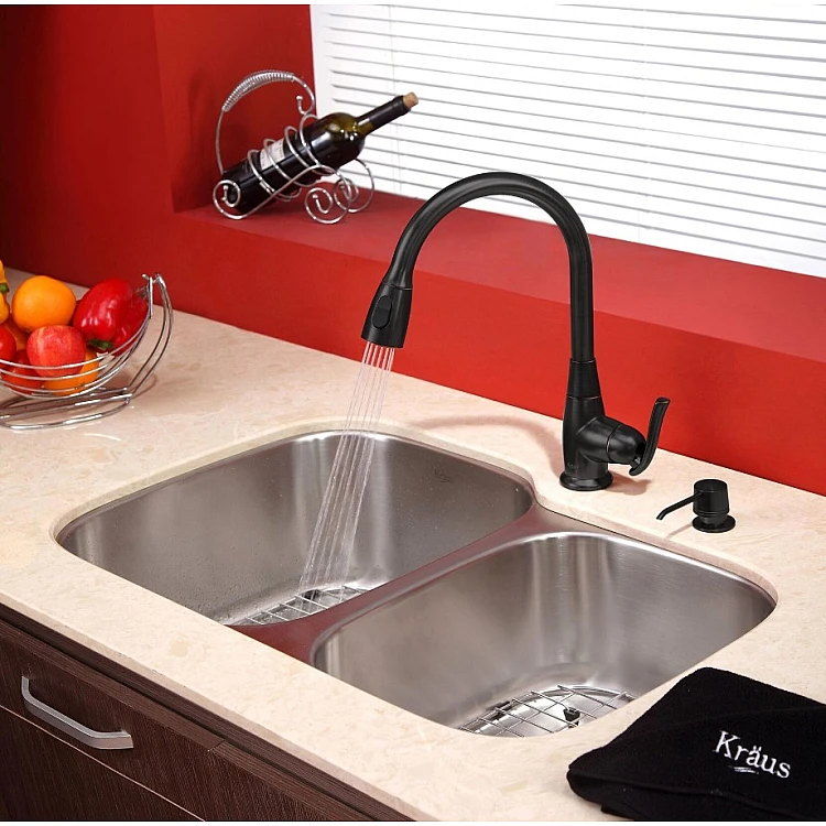В коллекции смесителей Kraus совмещает функциональность со стилем. Каждый смеситель изготовлен из сертифицированной бессвинцовой латуни и высококачественных компонентов, включая высокоэффективный аэратор и керамический картридж для надежного использования без подтекания. Однорычажная конструкция упрощает регулировку температуры и давление воды. Доступны разные варианты отделки для того, чтобы смеситель соответствовал декору вашей кухни. Каждый смеситель устойчив к коррозии и прост в эксплуатации. Этот смеситель в украшении цвета черной бронзы обеспечит Вам гибкую функциональность, поскольку оснащен выдвижной эргономичной распылительной насадкой с двумя режимами подачи воды – аэрированной струей и мощным душем. Чистые линии дизайна создают утонченный современный вид. Крепление в одно отверстие позволяет легко интегрировать этот смеситель в мойку. Для облегчения установки предоставляется все монтажное оборудование.