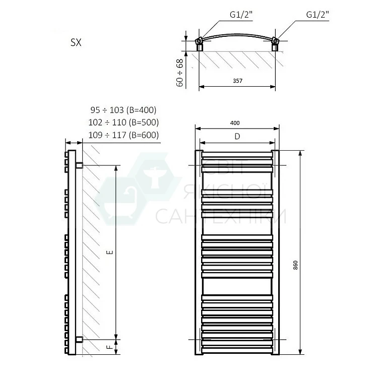 Рушникосушка водяна Terma Dexter 860x400 WGDEX086040KCROSX, хром
