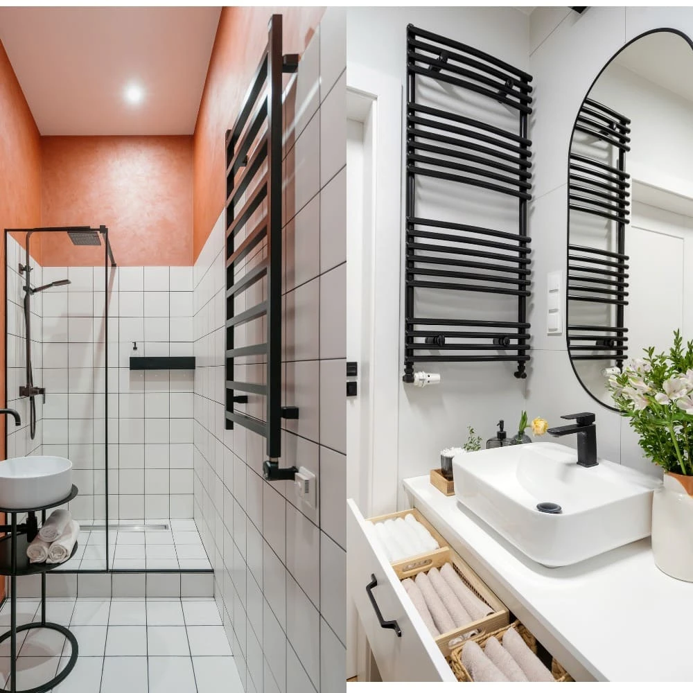 - Чорна рушникосушка. Чорні моделі, особливо матові, стали популярними через сміливість, елегантність. Вони створюють сучасний стильний контраст, додають інтер'єру глибину, яскравість. Чорні вироби також добре поєднуються з іншими чорними аксесуарами, металевим декором.