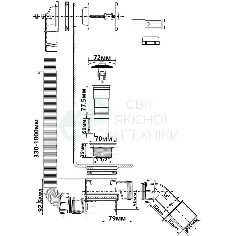 сифон для ванни, з переливом, з донним клапаном