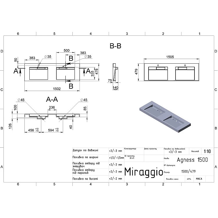 Умивальник AGNESS 1500 від бренду MIRAGGIO - це ідеальне рішення для санвузла дому, готелю чи дачі.