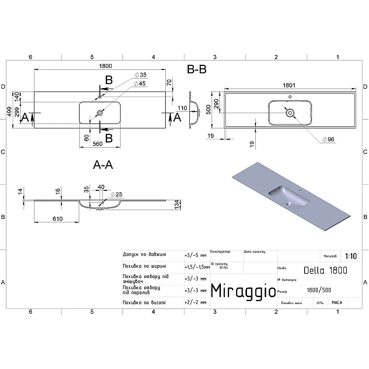 Характеристики - Умивальник MIRAGGIO DELLA 1800 Miramarble білий глянцевий