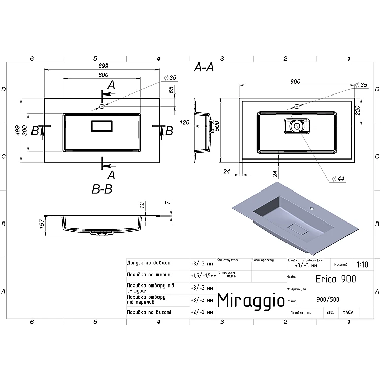 Характеристики - Умивальник MIRAGGIO ERICA 900 Miramarble білий глянцевий