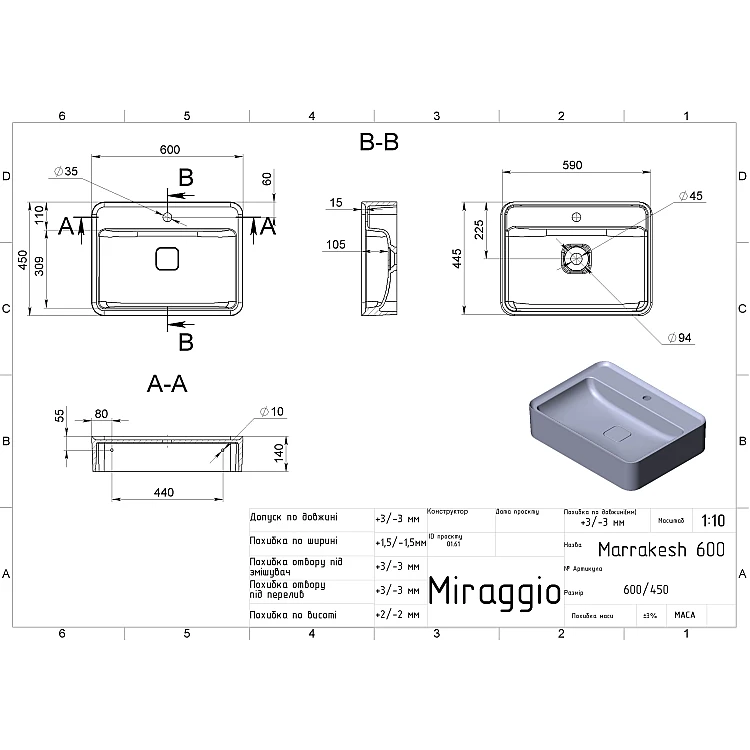 Характеристики - Умивальник MIRAGGIO MARRAKESH 600 Miramarble білий глянцевий