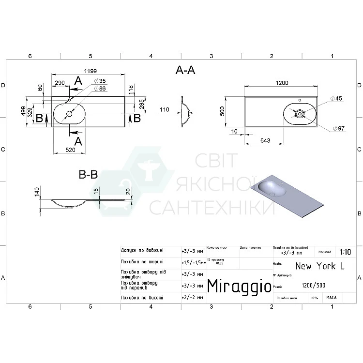 Характеристики - Умивальник MIRAGGIO NEW YORK 1200 L Miramarble білий глянцевий