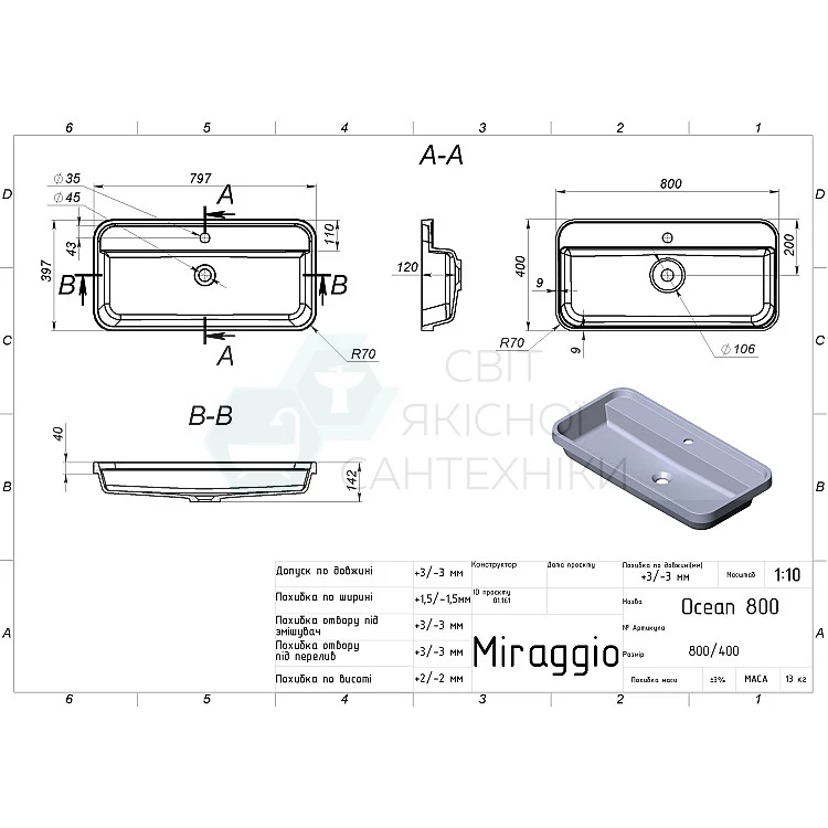 Умивальник OCEAN 800 від бренду MIRAGGIO - це ідеальне рішення для санвузла дому, готелю чи дачі.