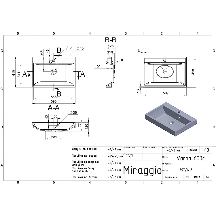 Умивальник VARNA 600 від бренду MIRAGGIO - це ідеальне рішення для санвузла дому, готелю чи дачі.