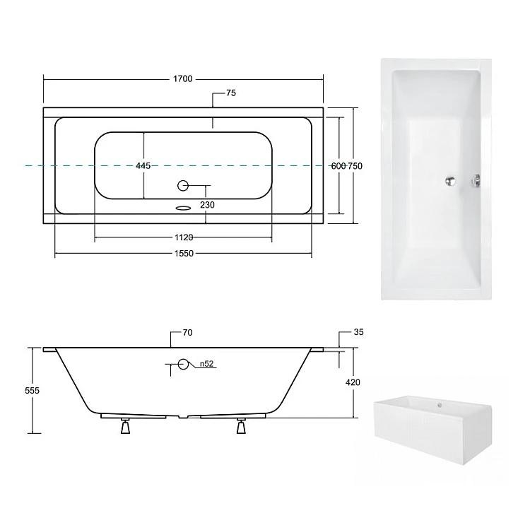 Ванна акрилова Quadro Slim 170х75 без ніг