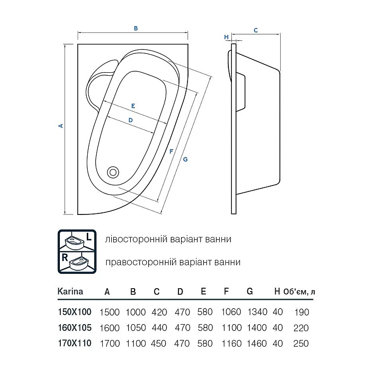 Ванна Koller pool Karina 170х110 асиметрична R-правостороння