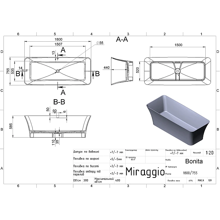 Характеристики - Ванна окремостояча MIRAGGIO BONITA Miramarble Matt 180x75 біла матова