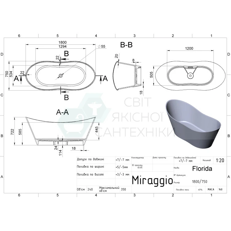 Характеристики - Ванна окремостояча MIRAGGIO FLORIDA Miramarble 180x75 біла глянцева