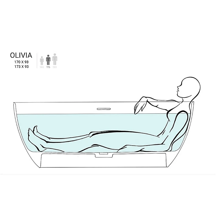 Компактні розміри моделі дозволяють ефективно використовувати простір, залишаючи більше можливостей для дизайнерських рішень. Ванна OLIVIA однаково ефектно виглядає як біля стіни, так і в центрі приміщення, створюючи стильний акцент у ванній кімнаті. Особливо гармонійно вона поєднується з раковинами сучасного дизайну з цієї ж серії.