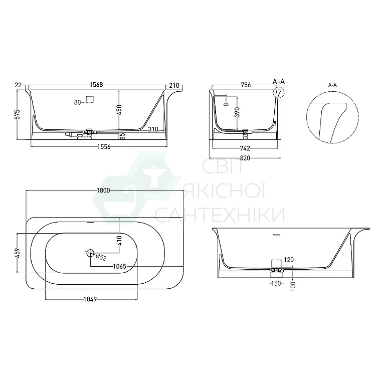 Опис товару - Ванна окремостояча WGT Water Stone LINEA 1800×820, білий матовий