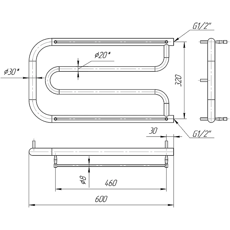 Водяна рушникосушка Фокстрот 350х600 з міжосьовою відстанню для підключення 320 мм, діаметр підключення G 1/2'' складається з 1 згибу ребра. Рушникосушка Фокстрот підприємства Mario виготовлена з нержавіючої сталі АІSI 304 може бути обладнана електричним теном.
