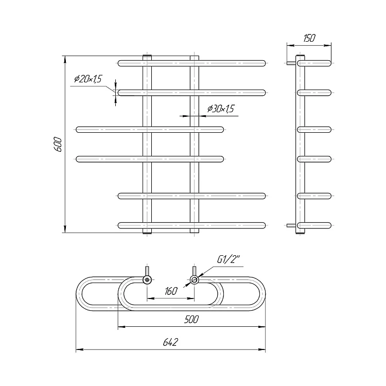 Водяна рушникосушка Парус 600х500 з міжосьовою відстанню для підключення 160 мм, діаметр підключення G 1/2 '' складається з 6 ребер. Рушникосушка Парус підприємства Mario виготовлена з нержавіючої сталі АІSI 304 може бути обладнана електричним теном.