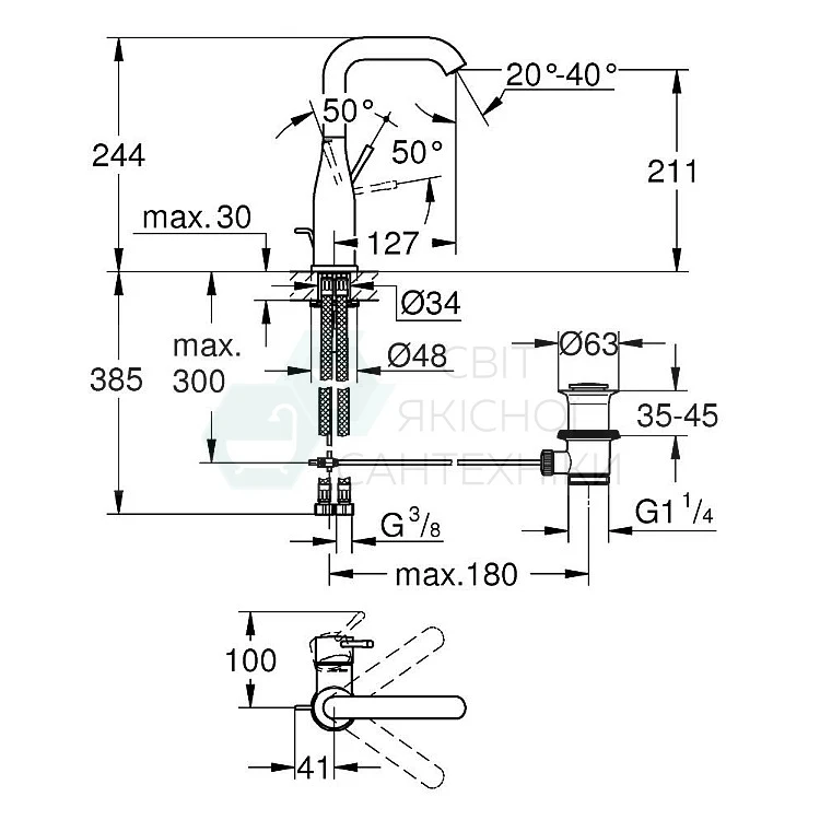 монтаж на один отвір металевий важіль GROHE SilkMove 28 мм керамічний картридж із обмежувачем температури GROHE Long-Life поверхня GROHE Water Saving – технологія неперевершеного потоку при економному використанні води максимальна витрата (при тиску 3 бар) 5 л/хв GROHE AquaGuidе аератор, що регулюється GROHE FastFixation Plus система швидкого монтажу обертовий вилив із аератором і стопором регульована площина обертання 0° / 150° / 360° набір донних клапанів 1 1/4" гнучкі з'єднувальні шланги мінімальний рекомендований тиск 1.0 бар