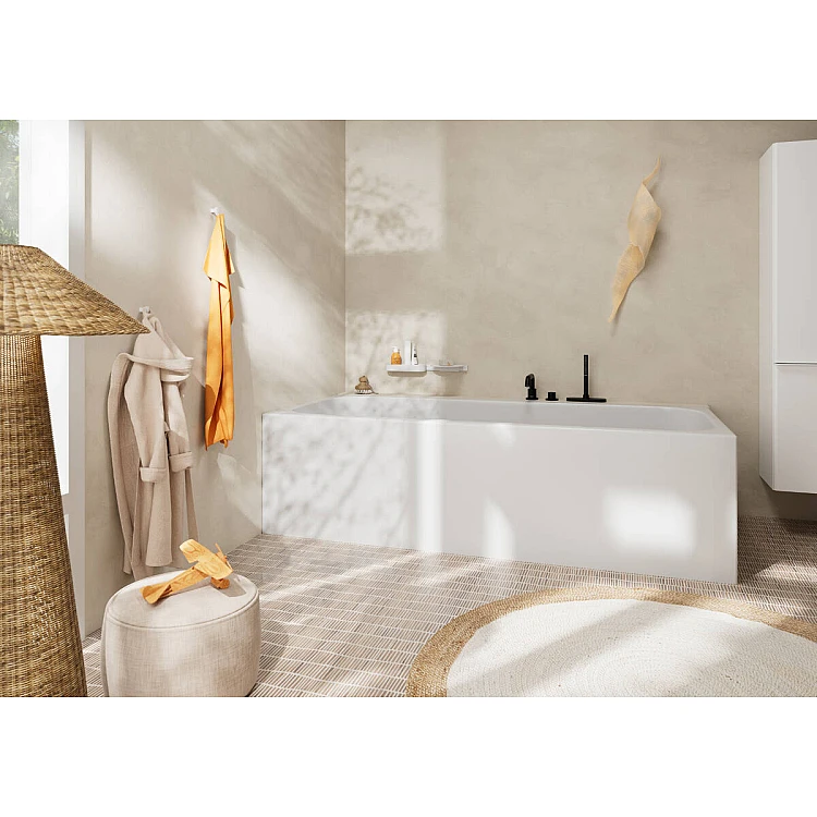 складається з: одноважільного змішувача для ванни на 3 отвори, ручного душу, тримача для душу, душового шланга, коробки для шлангу 2 функції виступ: 194 мм змішувач розпилювального типу: звичайний розпилювач Ручний душ типу розпилення: PowderRain максимальна довжина висувного ручного душа: 1,45 м sBox для тихого, плавного та захищеного напряму шланга керамічний картридж дивертер з автоматичним скиданням зворотний клапан захищений від зворотного потоку, відповідно до DIN EN 1717 приєднувальний розмір: DN15 тип підключення: базовий комплект хв. робочий тиск: 1 бар макс. робочий тиск: 10 бар