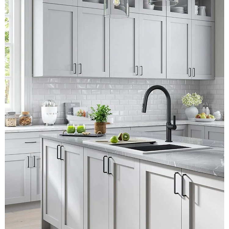 Обтічний і елегантний Oletto ™ виділяється сучасним дизайном та універсальної привабливістю. Кожна деталь дизайну ретельно продумана, щоб створити ідеально збалансований змішувач, який прикрасить будь-яку кухню або приміщення пральні. Високий дугоподібний вилив забезпечує максимальний простір для габаритних предметів, таких як великий посуд і високі каструлі. Ергономічна ручка зі зручною рукояткою, розроблена для простоти використання, повертається на 90 ° вперед, забезпечуючи плавність ходу і установку в приміщеннях з обмеженим вільним простором. Висувна лійка на шланзі з поворотним адаптером забезпечує максимальну маневреність, плавне втягування і надійне стикування, що дозволяє згинатися, повертатися і дотягуватися до всього навколо раковини. Надійна конструкція з цільноцільноі латуні не містить свинцю і включає в себе найсучасніші компоненти, в тому числі керамічний картридж, розрахований на термін служби в два рази довший ніж промисловий стандарт, для забезпечення безпроблемного використання протягом усього життя. Установка проста і зручна завдяки гнучким попередньо приєднаним водопровідним шлангам, противазі QuickWeight , що замикається і легко встановлюється, та блоку QuickConnect, який замикається для герметичного з'єднання. Для додання індивідуальності зовнішнього вигляду вибирайте з безлічі міцних і стійких до корозії покриттів, які покликані захищати ваш змішувач протягом всього терміну служби.